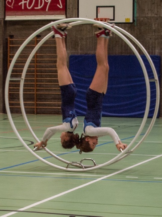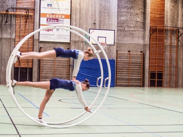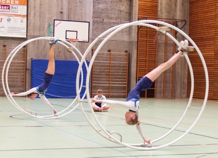 Nach diesem ruhigen Tag fanden für alle aus der LSV am Samstag die Wettkämpfe statt. Innerhalb von 10 Min. hatten wir die Pestalozzi-Halle erreicht und konnten uns einturnen. Am Vormittag waren wir Rhönradturnerinnen mit dem Kür-1-Kampf an der Reihe. Beim Kür-2-Kampf waren wir eingeplant als Linien- und Kampfrichter. Gegen Abend konnten wir dann mit Laura mitfiebern, die im Synchronturnen gemeinsam mit Alina Lörz für Neckargemünd angetreten ist.