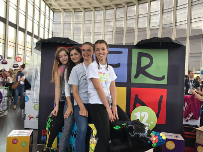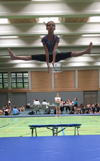 Nach einem kurzen Besuch der Altstadt und Münster stand am nächsten Tag der Wahlwettkampf auf dem Programm. Lea, Mira, Sofia und Eva starteten in den Disziplinen Trampolin, Zielwerfen, Staffellauf und einer Überraschungsaufgabe, dem Pyramidenbau. Sie erreichten Platz 26. Danach absolvierten alle den "Muck und Minchen Test" mit Aufgaben aus dem Bereich Turnen sowie den Fitness-Test "Fit wie ein Turnschuh" und erhielten Urkunden und Medaillen. Dann war Zeit um die Mitmach-Angebote wir Bungee-Trampolin, Kletterturm, Turnbeutel bedrucken und vieles mehr auszuprobieren und das Showprogramm auf der Bühne zu bestaunen. Am Abend wurde noch die "Stars und Sternchen Show" besucht, moderiert von Muck und Minchen, den Maskottchen der badischen Turnerjugend.