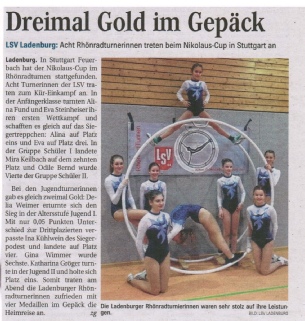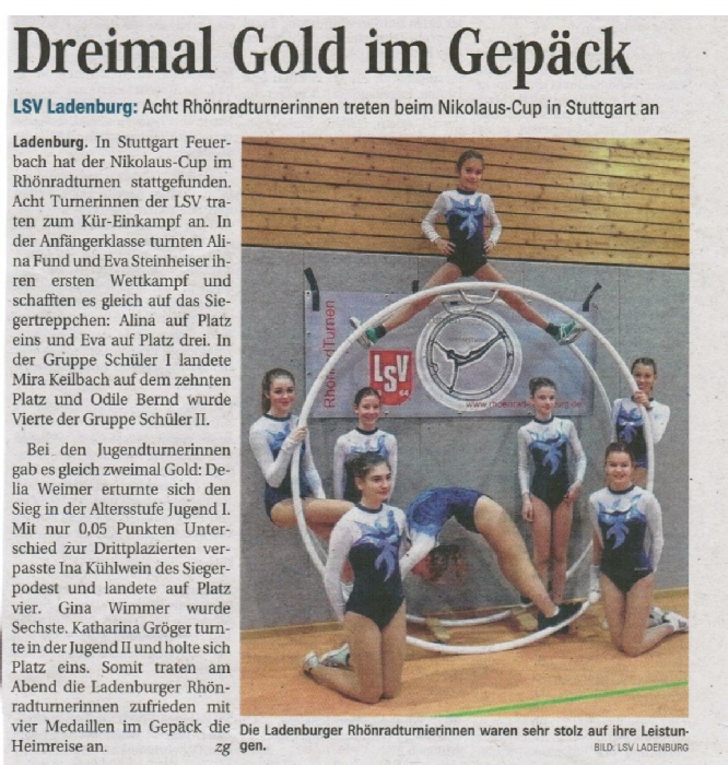 Die Badischen Pokalwettkämpfe im Rhönradturnen fanden am 7. März in Neckargemünd statt. Von der Ladenburger Sportvereinigung starteten 9 Turnerinnen im Zweikampf Pflicht und Kür.